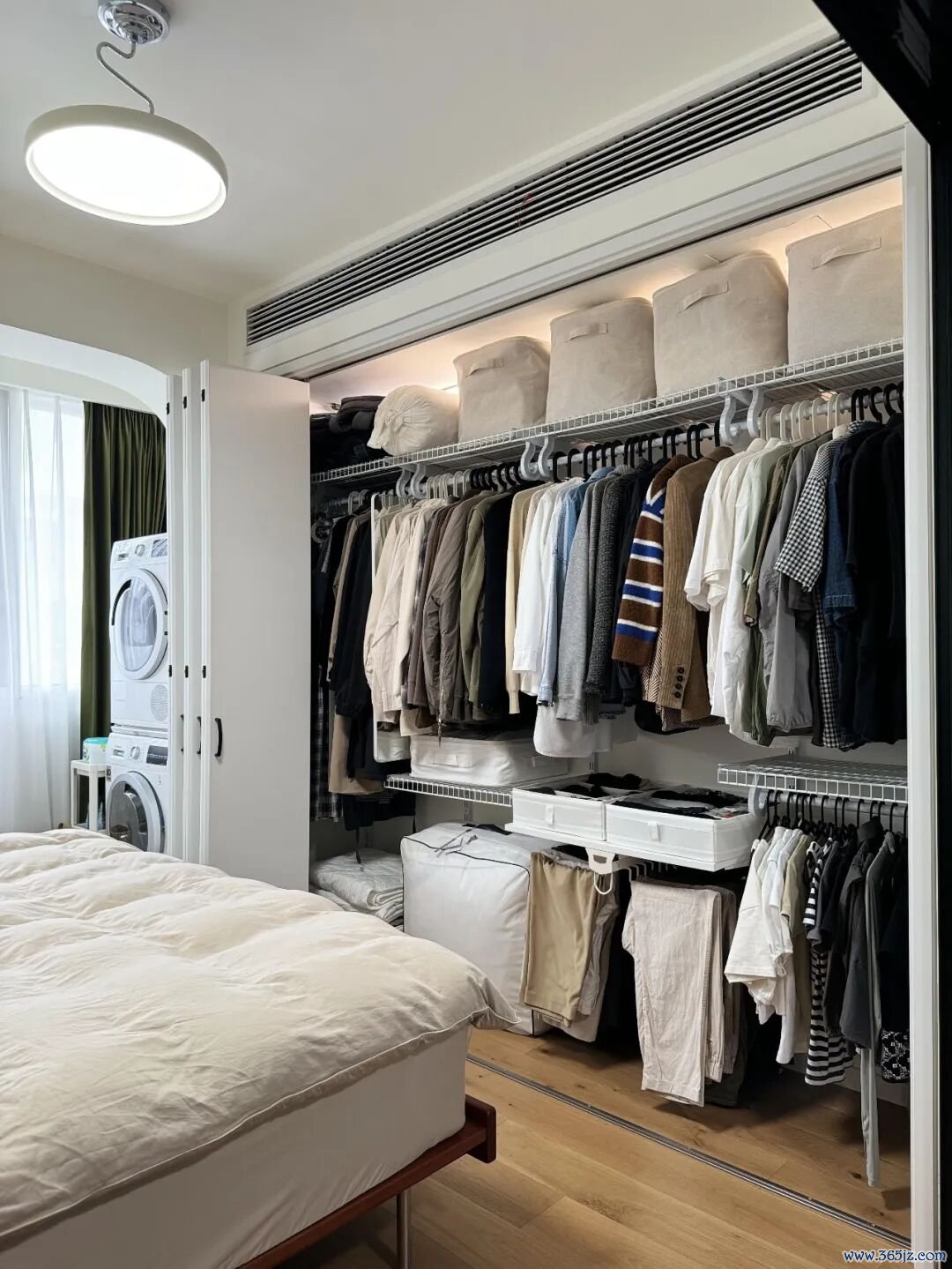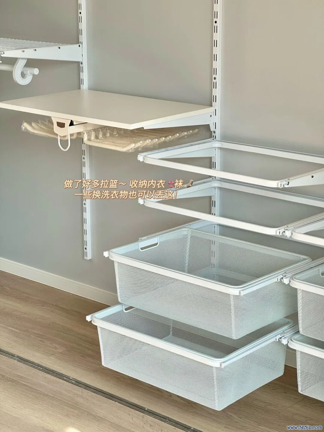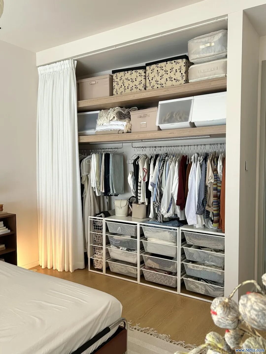 贴身衣物、袜子用拉篮装,长衣、短衣分区挂,甚至行李箱,都能塞在衣柜底下。