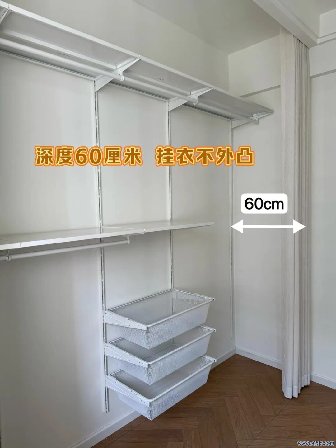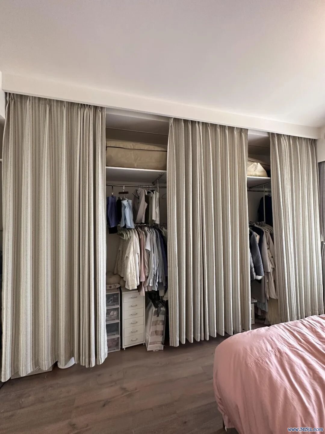 最关键的是省钱!要是找全屋定制,一个3米×2.4米的衣柜,算上五金配件,至少5000起步,稍微好点的,直接破万。而这种金属架+窗帘,不到1500就能拿下。