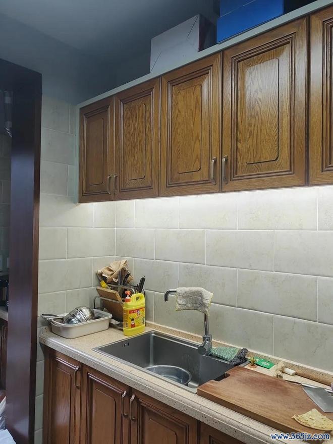 如果想省事,还可以在吊柜上面放一层塑料膜,用于防油污的,只要定期更换就行,这样就省除打扫的烦恼了。